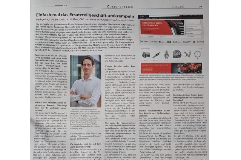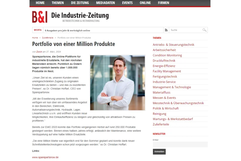 Wer heute Ersatzteile beschafft, erwartet Geschwindigkeit, Verfügbarkeit und einfache Prozesse. Genau das bietet SPAREPARTSNOW als eine der am schnellsten wachsenden B2B-Plattformen Europas. Im Interview erklärt Geschäftsführer Christian Hoffart, warum auch zunehmend große Konzerne wie SCHAEFFLER; FLENDER, Bosch u.v.m. längst auf SPAREPARTSNOW setzen.