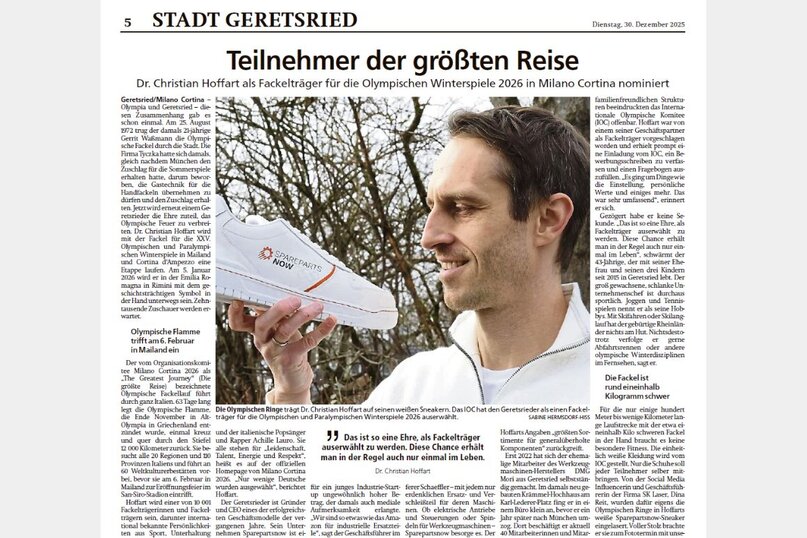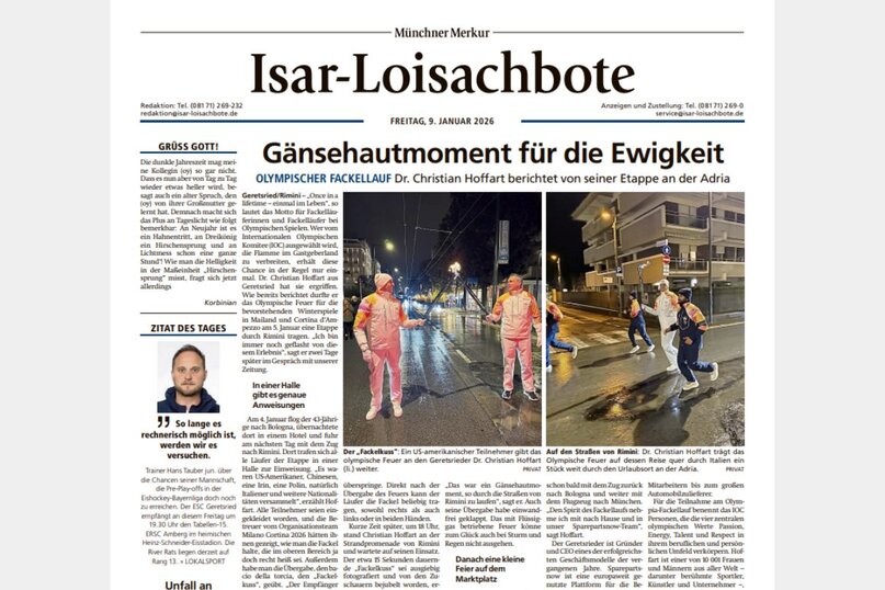Wer vom Internationalen Olympischen Komitee(IOC) ausgewählt wird, die Flamme im Gastgeberland zu verbreiten, erhält diese Chance in der Regel nur ein mal. Dr. Christian Hoffart aus Geretsried hat sie ergriffen. Wie bereits berichtet durfte er das Olympische Feuer für die bevorstehenden Winterspiele in Mailand und Cortina d‘Ampezzo am 5. Januar eine Etappe durch Rimini tragen.