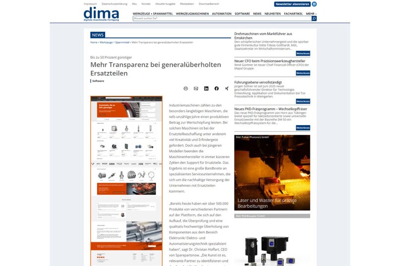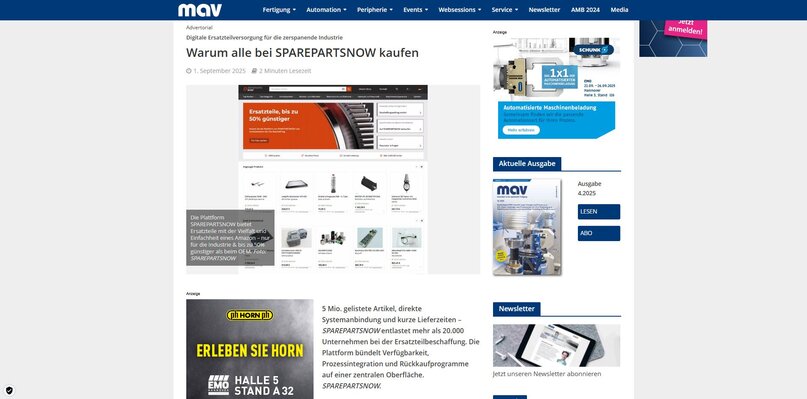 Im Oktober 2022 ist die Plattform SPAREPARTSNOW mit 20.000 Produkten an den Start gegangen und hat seitdem immer größere Sprünge im Sortiment zu verzeichnen. Im September 2024 wurde die Marke von 2 Mio. Ersatzteile (Schwerpunkte: Elektronik, Spindeln, Lager) überschritten.