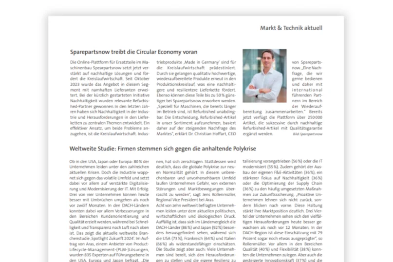 Die Online-Plattform für Ersatzteile im Maschinenbau Sparepartsnow setzt jetzt verstärkt auf nachhaltige Lösungen und fördert die Kreislaufwirtschaft. Seit Oktober 2023 wurde das Angebot in diesem Segment mit namhaften Lieferanten erweitert.